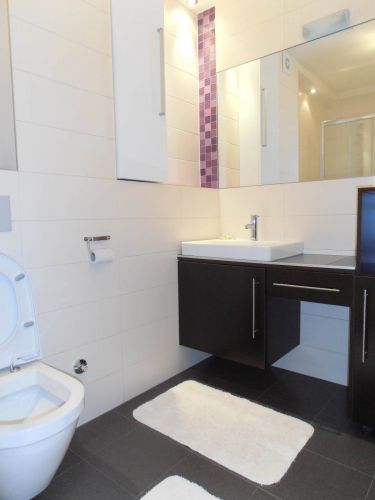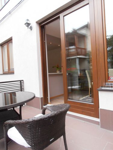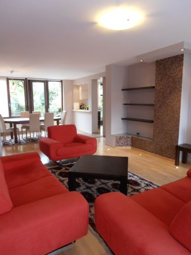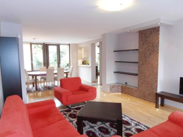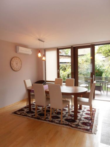 The apartment has 100 m², and comprises big bright living room ( exit to balcony from where you have beautiful view at city),with dining room area(from where you can enter to terrace and go directly to back garden of the house),kitchen,1 bedroom,1 study/work room,bathroom,another bedroom with bathroom and pantry.