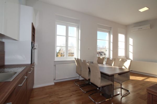Apartment comprises living room with dining area and modern kitchen with balcony.There are 3 bedrooms(one has its own bathroom),hallway with in-build wardrobe and another bathroom .Apartment has garage.