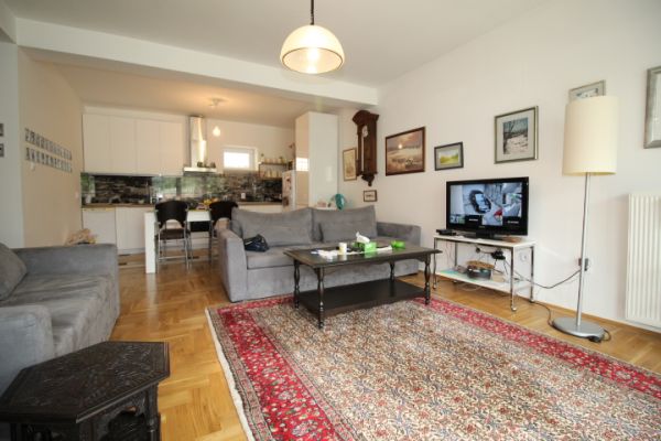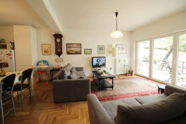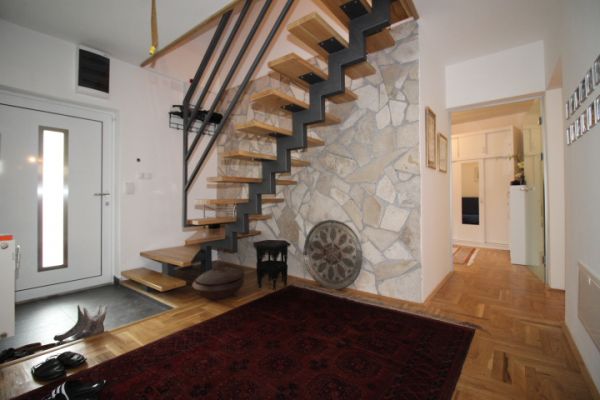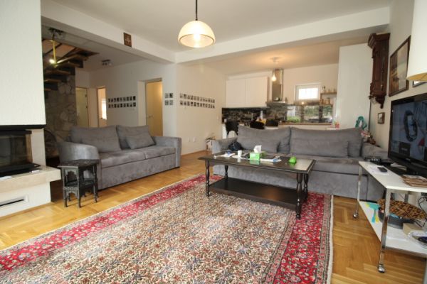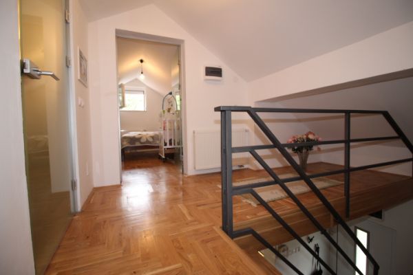 House comprises 3 bedrooms, living room with fireplace , dining room, modern kitchen.From living room exit to terrace and from there to garden. On this level are also 2 bedrooms and bathroom.