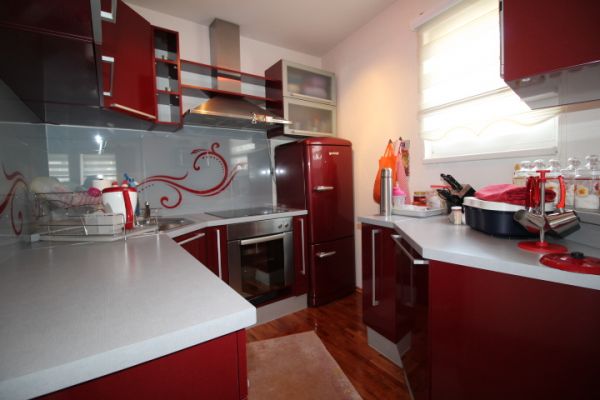 Size is 120 square meters and comprises entrance hall,living room , dining area ,partially separated modern kitchen, 2 bedrooms,study space, bathroom,toilette,balcony and pantry/laundry room.