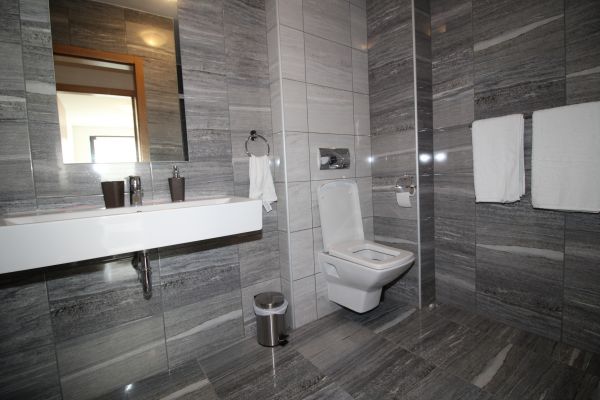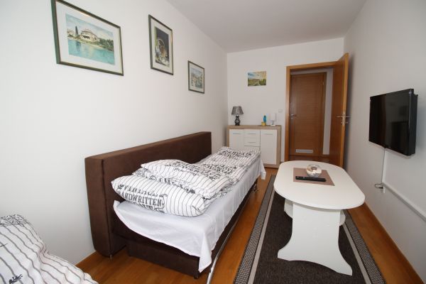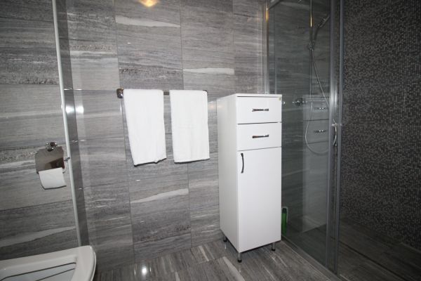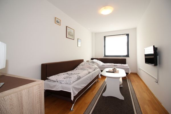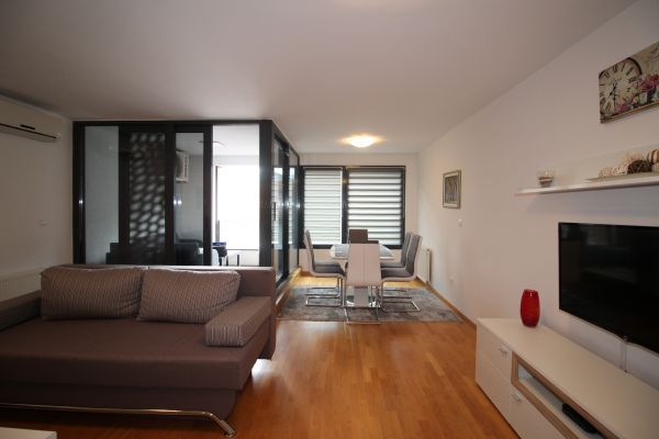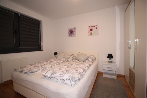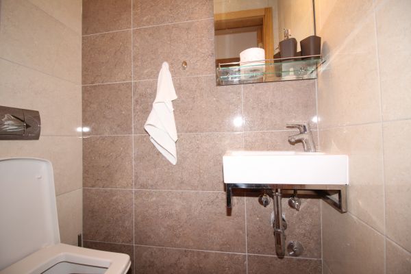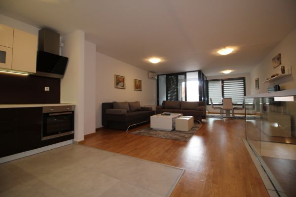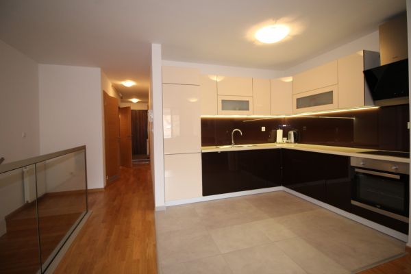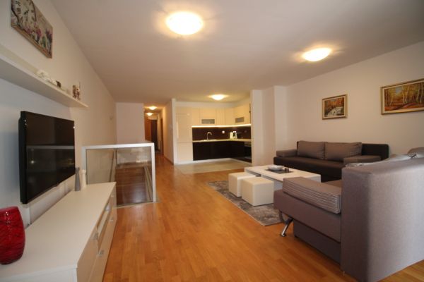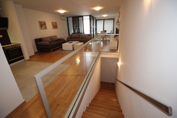 Each apartment has open living room,dining area with balcony,kitchen,toilette,boiler room-storage,main bedroom with bathroom.On bottom floor are 2 bedrooms,bathroom,laundry room,