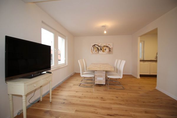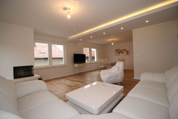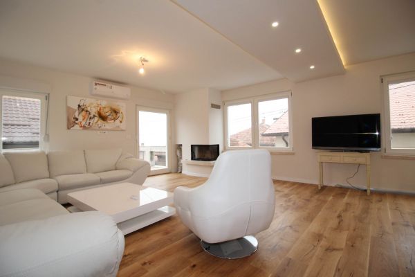 1.st level- big open living room (fireplace and exit to terrace)with dining area and semi closed kitchen, 1 bedroom with bathroom, another bedroom,bathroom