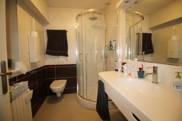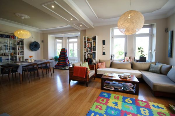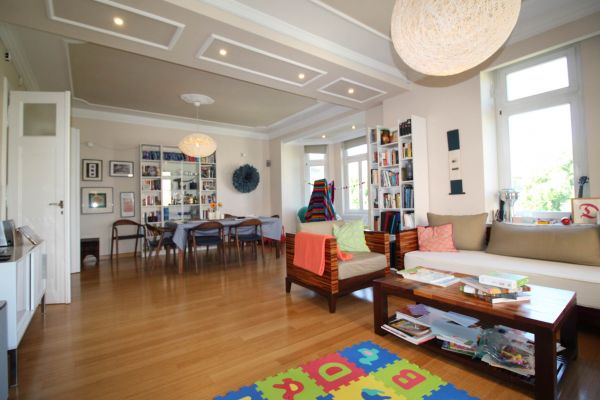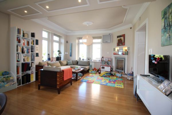 Apartment comprises entrance hall,boiler and pantry room,big open ,bright living room(fireplace) with dining area and semi open beautiful kitchen. On left are 3 bedrooms,2 bathrooms, on right is 1 main bedroom with its own bathroom and connection to another room(nursery,study room,hobby room)and small balcony.