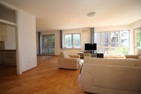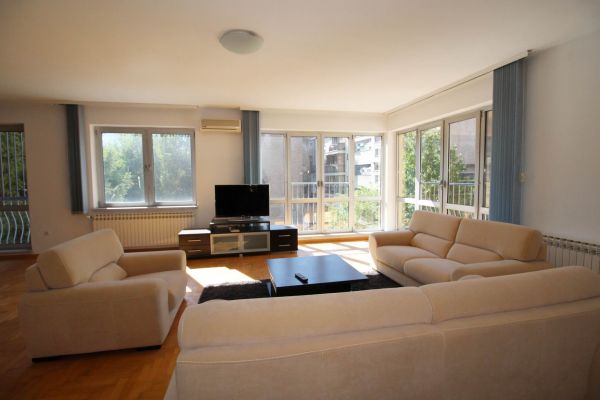 This apartment has 150 sqm and comprises big bright living room and dining area with kitchen,3 bedrooms,one open glassed room that could be used as study (hobby) room /office space/ library,3 bathrooms and entrance hall .