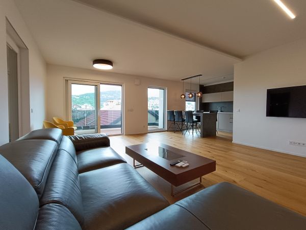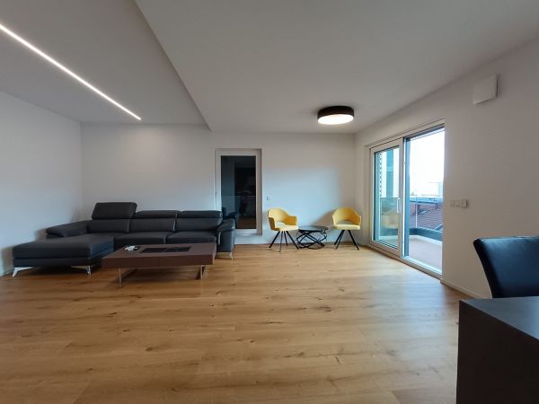 New modern furnished 3 bedroom apartment in a new building, size 105 square metres , located on the second floor of a new residential building with an elevator. The apartment consists of a hallway, a spacious, bright, open plan living room with a dining room and a kitchen, a balcony of approx. 10 m2, three bedrooms, one of which is a master bedroom with a shower, a bathroom and a small toilet.