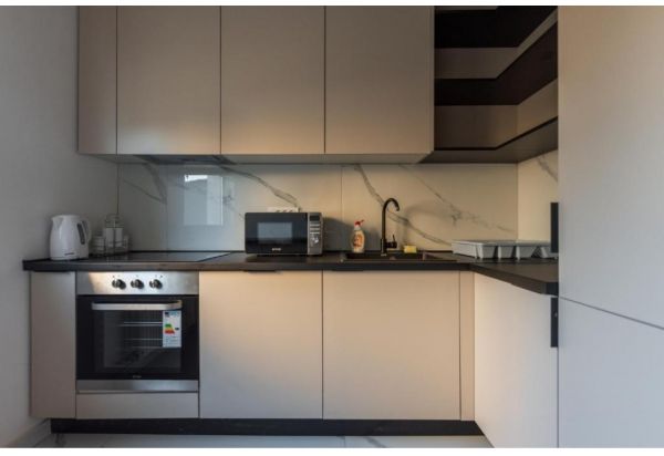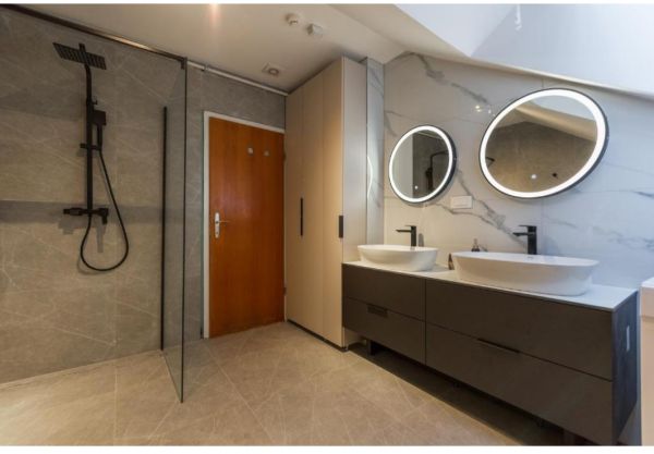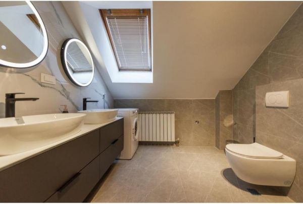 Ground floor comprises 40 sqm of studio apartment area (living room, dining room, bedroom area with kitchen and bathroom) ,also on this level is laundry room and toilet. From this level is exit to big terrace and garden.