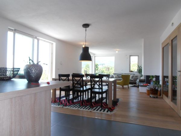 There are 220 square meters and consists: ground floor-spacious entrance, big open space for living room with fireplace, dining area and open plan kitchen with exit to the big terrace, toilette.At first floor is main bedroom with bathroom,, 2 more bedrooms, laundry room, boiler room, bathroom. Each bedroom has balcony with great view.There is also big attic space