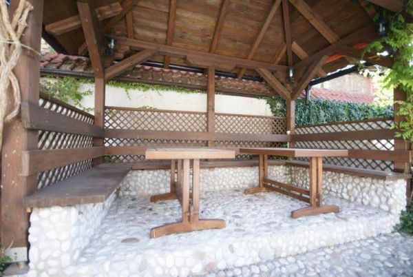 In big private garden is barbecue and a fountain.