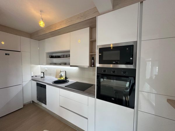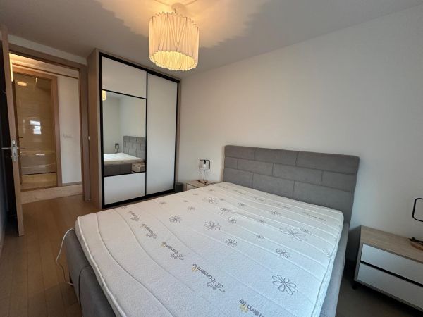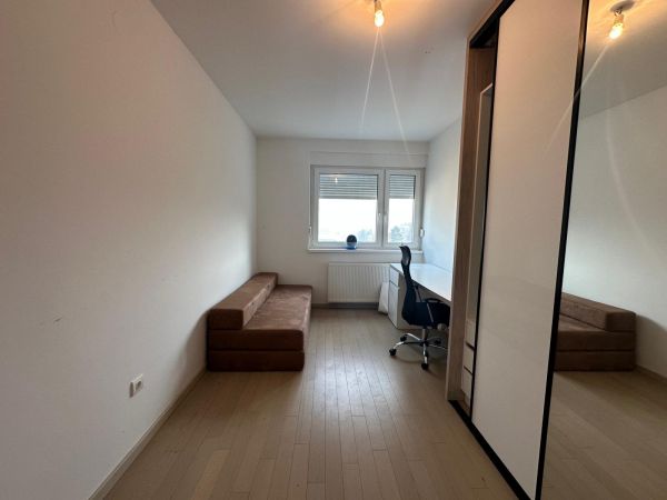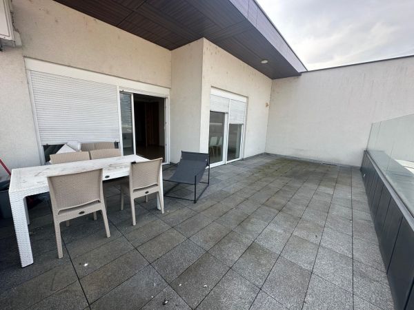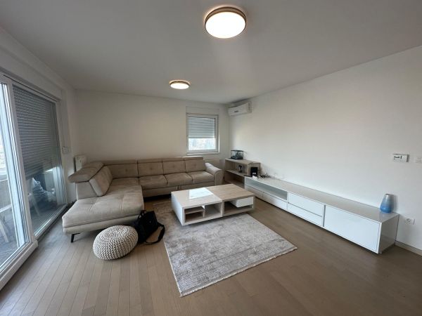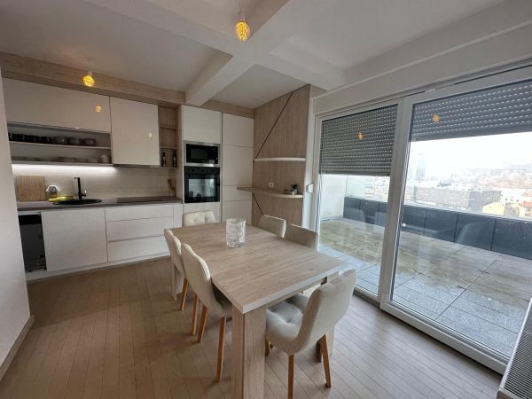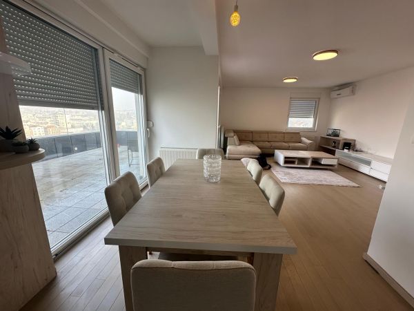 Modern furnished apartment of xx m2 located in recently build building in Skenderija area. The apartment is rented with parking space in garage on ground floor in the building. The apartment consists of big open space living room, and dining area with exit to terrace, semi detached kitchen , hallway, boyler room with storrage or pantry, 2 bathrooms, 2 bedrooms. Terrace is big and provides beautiful view on entire Sarajevo. Gas heating with back up. Cable TV. Internet.Alarm. Air conditioning. Video surveillance.