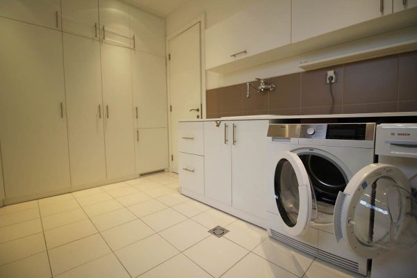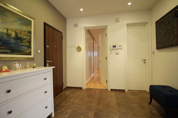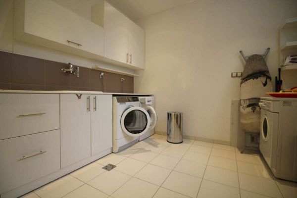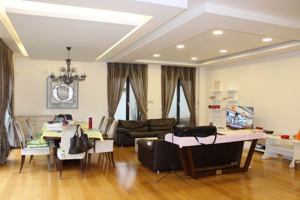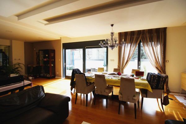 This apartment area of 210 square meters have spacious entrance hall, open floor living room area with dining room and kitchen from where is exit to terrace and garden,four spacious bedrooms, three bathrooms ,toilet, long hall with closets, spacious laundry room . Place offers 2 parking places for your cars inside of graded gates.