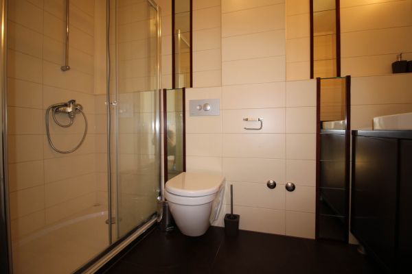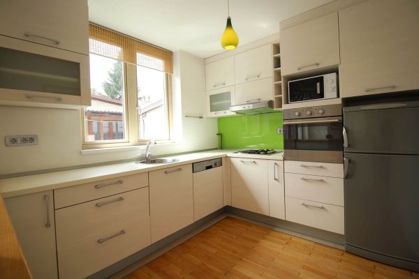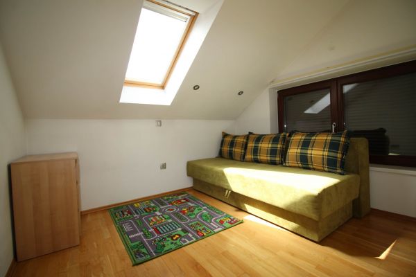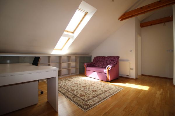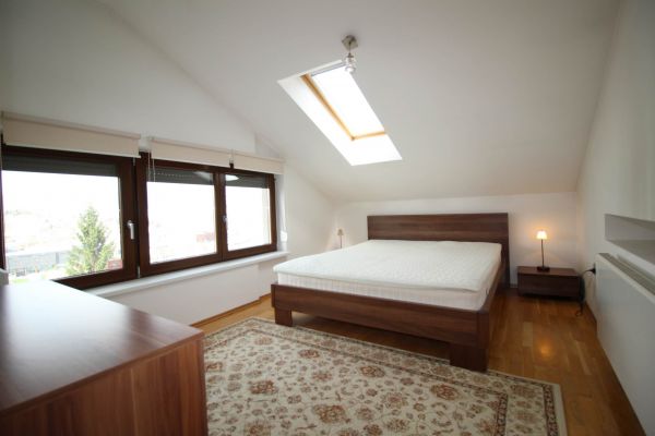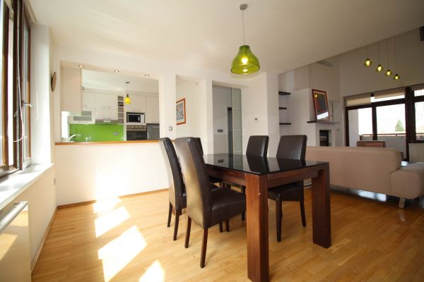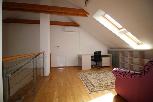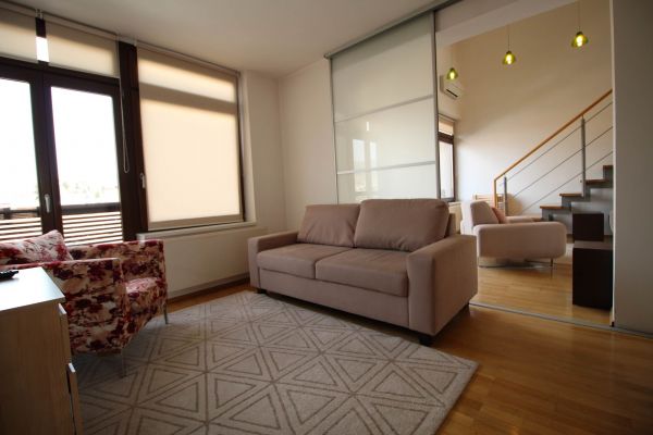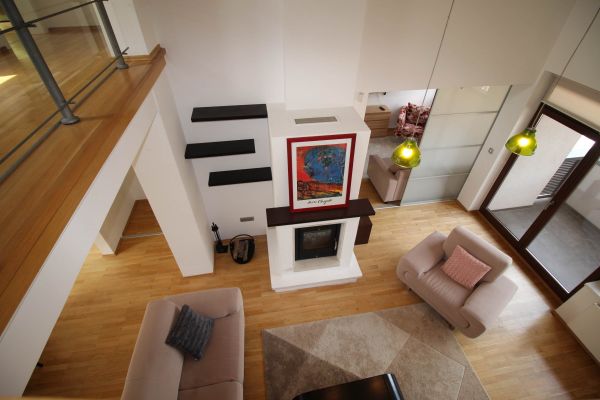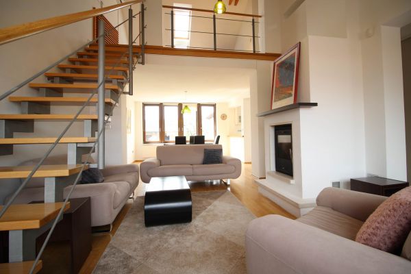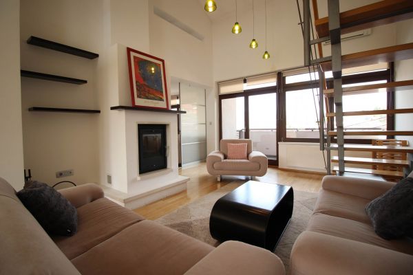 The apartment is on 2 level, has 120 m², and comprises entrance space,big bright living room/fireplace ( exit to balcony from where you have beautiful view at city),with dining area and kitchen,1 bedroom, one bathroom and one toilette and boiler room.