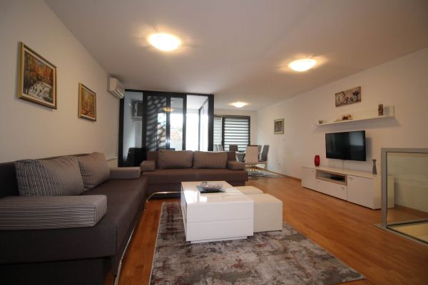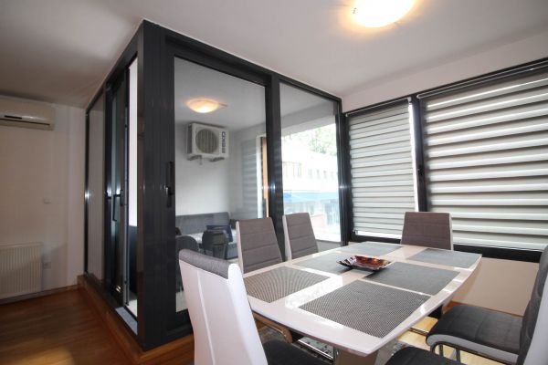 Each apartment has open living room,dining area with balcony,kitchen,toilette,boiler room-storage,main bedroom with bathroom.On bottom floor are 2 bedrooms,bathroom,laundry room,