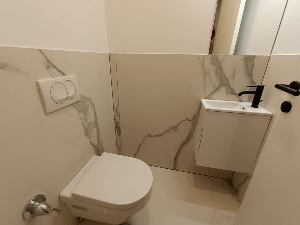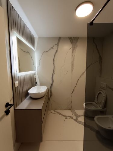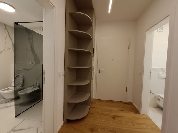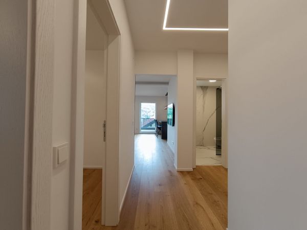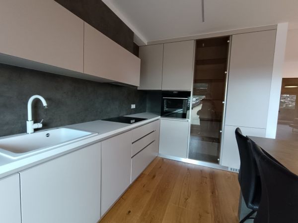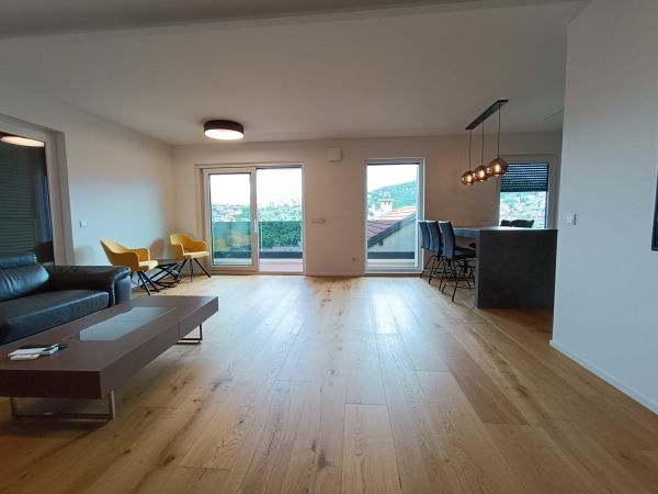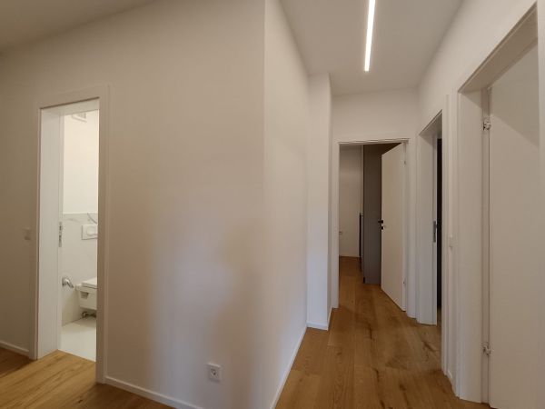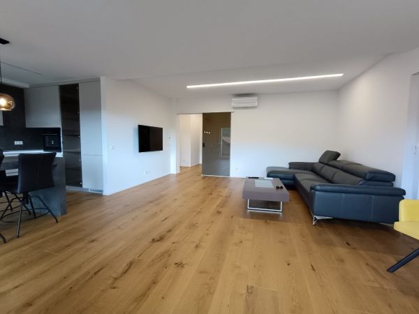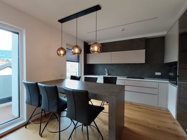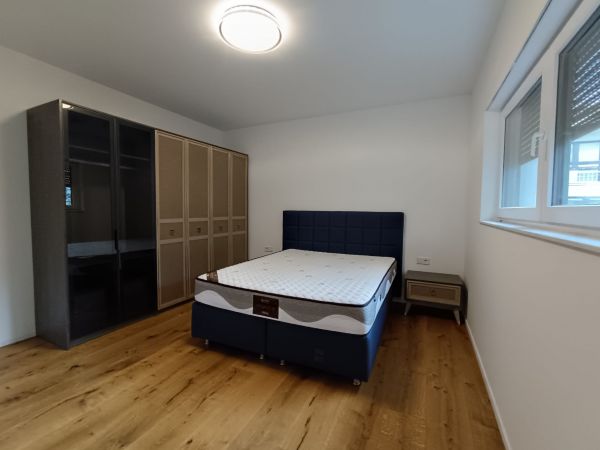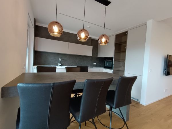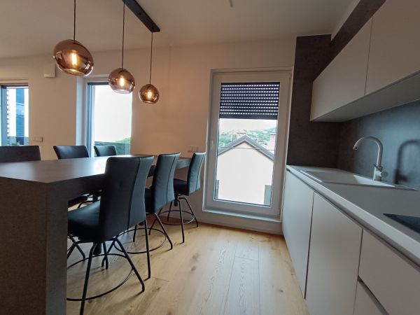 New modern furnished 3 bedroom apartment in a new building, size 105 square metres , located on the second floor of a new residential building with an elevator. The apartment consists of a hallway, a spacious, bright, open plan living room with a dining room and a kitchen, a balcony of approx. 10 m2, three bedrooms, one of which is a master bedroom with a shower, a bathroom and a small toilet.