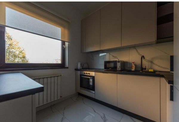 Ground floor comprises 40 sqm of studio apartment area (living room, dining room, bedroom area with kitchen and bathroom) ,also on this level is laundry room and toilet. From this level is exit to big terrace and garden.